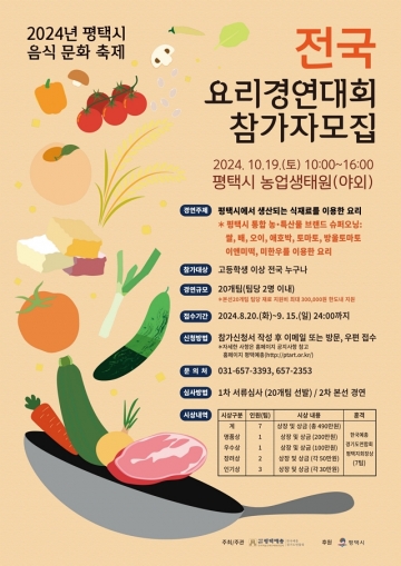 한국예총 경기도연합회 평택시지회(이하 평택예총)가 주최·주관하고 평택시가 후원하는 ‘2024년 평택시 음식 문화 축제 - 전국 요리경연대회’가 10월 19일 오전 10시~오후 4시, 평택시 농업생태원(오성면 청오로 33-34) 야외에서 열린다.