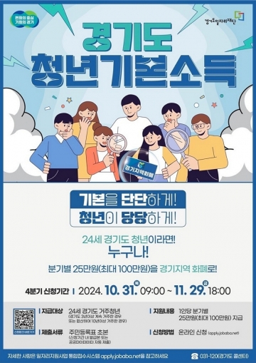 경기도 일자리지원사업 통합접수시스템 잡아바(apply.jobaba.net)에 10월 31일 이후 발급한 주민등록초본을 첨부해 신청하면 심사를 거쳐 12월 20일부터 카드형 지역화폐로 지급되며, 분기별 25만 원씩 1인당 연 100만 원이 지원된다. 지난 분기에 신청하지 못한 대상자는 이번 4분기 신청 기간 내에 소급 신청이 가능하다.