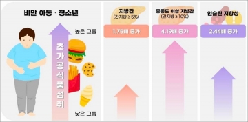 비만 아동·청소년에서 음료, 즉석식품 등 초가공식품의 섭취 비율이 높을 경우 지방간질환 위험이 1.75배, 인슐린저항성 위험은 2.44배 높은 것으로 나타났다.