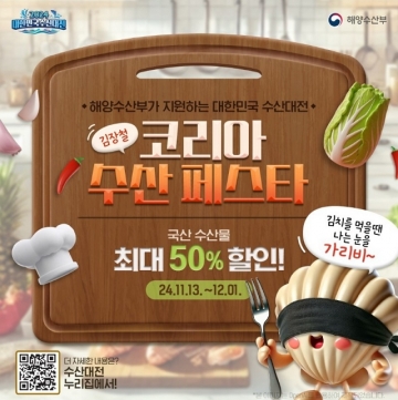 해양수산부는 김장철을 맞아 소비자 체감 물가를 완화하고 국산 수산물 소비를 촉진하기 위해 11월 13일부터 다음 달 1일까지 ‘코리아 수산페스타’ 할인 행사를 개최한다고 12일 밝혔다.