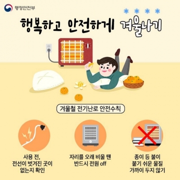행정안전부는 매년 겨울이면 전기난로와 전기장판의 부주의한 사용으로 화재가 발생하고 있는 만큼 예방에 각별한 주의를 요청했다.