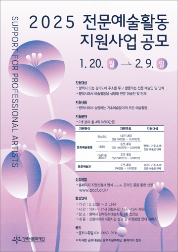 평택시문화재단(대표이사 이상균)은 지역 문화예술 활성화를 위한 전문예술인 및 예술단체 활동을 지원하는 ‘2025 전문예술활동 지원사업’ 공모 접수를 1월 20일부터 2월 9일까지 진행한다.
