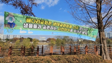 ▲ 주민들에게 생태공원의 생물을 지켜달라고 홍보했던 현수막(2024.11.18 배다리함양지)