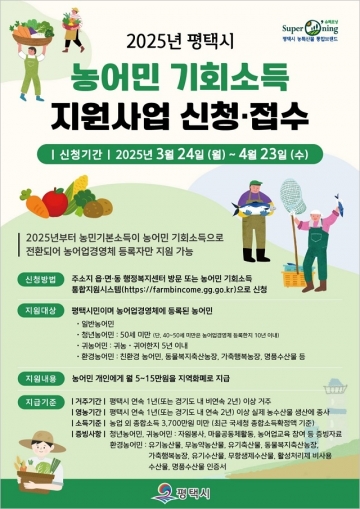 평택시(시장 정장선)는 오는 3월 24일부터 4월 23일까지 ‘2025년 농어민 기회소득’ 1차 신청을 받는다.