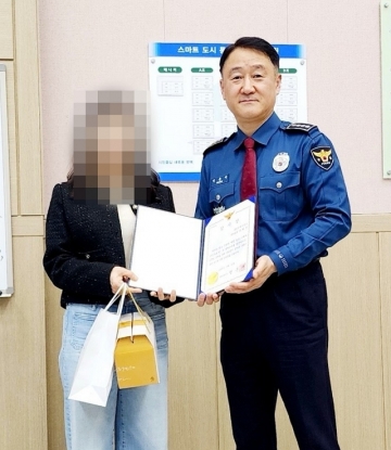 ▲ 관제요원 A씨에게 감사장을 수여하는 맹훈재 서장