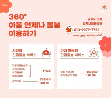 긴급돌봄 서비스는 콜센터(☎ 010-9979-7722)에서 신청 가능하고, ‘언제나돌봄 플랫폼(www.gg.go.kr/always360)’에서도 회원가입을 통해 사전 아동 등록 및 돌봄서비스 신청이 가능하다.