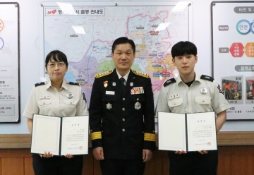 ▲ 왼쪽부터 김수희 소방위, 김진학 서장, 김성현 소방사