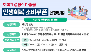 신청은 7월 21일 오전 9시부터 9월 12일 오후 6시까지 온·오프라인으로 신청할 수 있으며, 신용·체크카드, 선불카드, 지역사랑상품권 중 원하는 방식을 선택해 지급받을 수 있다.
