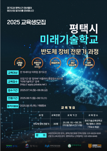 평택시(시장 정장선)는 오는 8월 18일부터 10일간 ‘2025년 평택시 미래기술학교 반도체 장비 전문가 과정’을 운영한다.