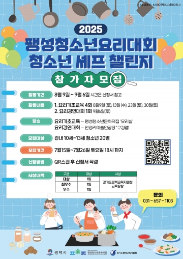 ‘청소년 셰프 챌린지’ 참가 신청 등 관련 문의는 팽성청소년문화의집(☎ 031-657-1103)으로 하면 된다.