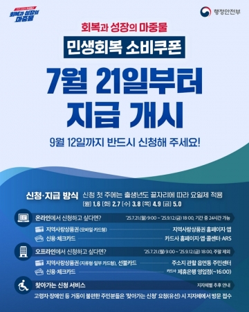 한편, 민생회복 소비쿠폰 신청은 9월 12일 오후 6시까지 온라인 또는 오프라인으로 신청할 수 있으며, 신용·체크카드, 선불카드, 지역사랑상품권 중 원하는 방식을 선택해 지급받을 수 있다.