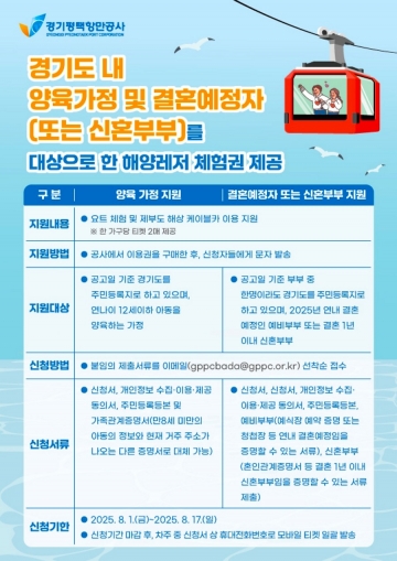 해양레저 체험 티켓은 연 나이 12세 이하 아동을 양육하는 가정과 2025년 연내 결혼 예정자 또는 1년 이내 신혼부부를 대상으로 한 가구당 2장의 티켓을 제공한다. 경기평택항만공사 누리집(www.gppc.or.kr)을 통해 상세한 신청 방법과 체험 프로그램 내용을 확인할 수 있으며, 8월 1일~17일까지 선착순이다.