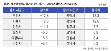 경기도일자리재단의 최근 고용이슈리포트에 따르면, 부천·시흥·안산 등 전통 제조업 밀집 지역은 최근 3년간 지속적으로 고용이 줄고 있는 반면, 평택시는 같은 기간 약 1만3,000명 이상 제조업 고용이 증가한 것으로 나타났다.