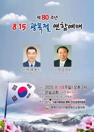 평택시 남부지역기독교연합회(회장 박태용 목사, 이하 평기남)는 8월 10일(일) 오후 2시 경기도 평택시 세교동에 소재한 평택은실교회(김자연 목사 시무)에서 지역 내 각 교회 목회자와 성도가 참석한 가운데 기길선 목사(평기남 전 회장)를 강사로 초청해 광복절 80주년 기념 연합예배를 갖는다.