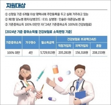 지원 대상은 제1형 당뇨병(상병코드: E10)을 진단받고, 신청일 기준으로 평택시에 6개월 이상 주민등록을 두고 실제 거주하며, 기준중위소득 100% 미만인 주민에게 1인 최대 124만 원까지 지원하고 있다.