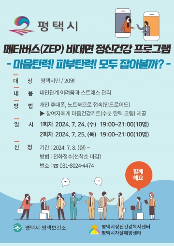 우울과 스트레스, 대인관계의 어려움 등으로 비대면 개별 상담을 원하는 시민은 평택시정신건강복지센터(☎ 031-8024-4474)에 문의하면 된다.