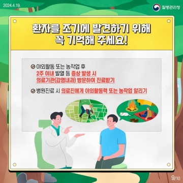 야외활동 후 진드기에 물린 자국(가피)이 관찰되고, 10일 이내 발열·발진 등 증상이 나타나면, 쯔쯔가무시증을 의심하고 의료기관을 방문해 치료를 받아야 한다.