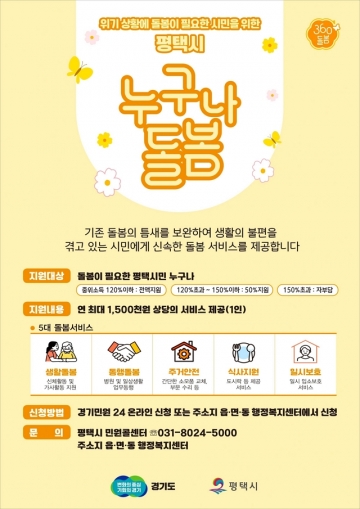 누구나 돌봄은 기존 돌봄의 틈새를 보완해 생활에 불편을 겪고 있는 시민에게 신속한 돌봄서비스를 제공하는 사업으로, 평택시는 올해 1월부터 생활돌봄, 동행돌봄, 주거안전, 식사 지원, 일시보호 등의 5대 돌봄서비스를 제공하고 있다. 평택시민이라면 누구나 1인 연 최대 150만 원 이내의 서비스를 받을 수 있으며, 중위소득 120% 이하는 자부담 없이 최대 60시간까지 서비스 이용이 가능하다.