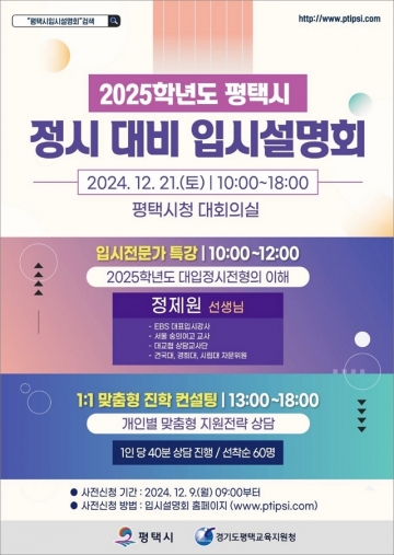 평택시(시장 정장선)는 수험생과 학부모들에게 최신입시 정보 제공을 위한 2025학년도 정시 대비 ‘입시설명회 및 컨설팅’을 개최한다.