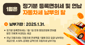 자동차세 연납 제도는 6월과 12월 두 차례에 걸쳐 부과하는 자동차세를 1월에 전액 납부하고자 신청하면 연간 납부할 자동차 세액의 약 4.58%를 공제받을 수 있는 제도로, 납부 시기에 따라 3월과 6월, 9월에도 각각 약 3.76%, 2.51%, 1.26%의 공제 혜택을 받을 수 있다.