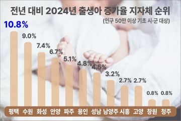 평택시(시장 정장선)가 인구 50만 이상 기초 시·군 가운데 2024년도 한 해 출생아 증가율이 가장 높은 도시로 집계됐다.