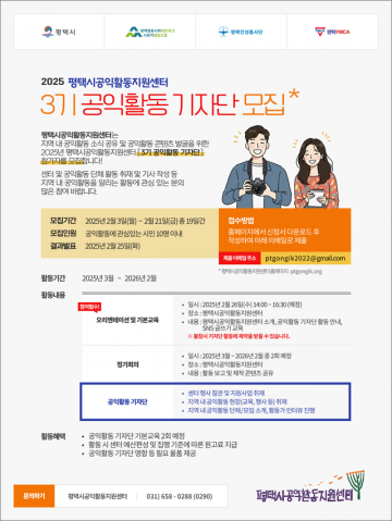 평택시공익활동지원센터(센터장 강미)는 2월 3일(월)~21일(금)까지 지역의 공익활동 소식을 발굴하여 취재하고 공익활동 콘텐츠를 제작하는 ‘3기 공익활동 기자단’을 모집한다.