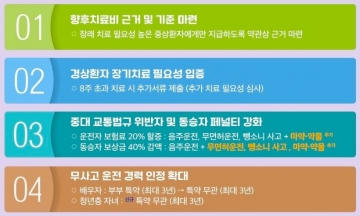 또 배우자와 자녀의 무사고 경력 인정을 확대하고, 특히 마약·약물 운전에 대해서는 음주운전 등 다른 중대 교통법규 위반과 마찬가지로 보험료를 20% 할증한다.