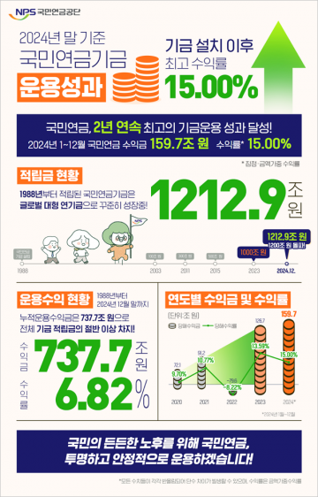 국민연금이 2년 연속 최고의 기금운용 성과를 거뒀다. 국민연금공단 평택안성지사(지사장 장재오)는 2024년 말 기준 국민연금기금 적립금 1,213조 원, 수익금 160조 원, 수익률 15.00%(잠정·금액가중수익률)를 기록했다고 밝혔다.