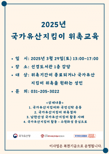 국가유산지킴이 경기인천권거점센터(센터장 신영주)는 오는 3월 29일(토) 오후 1시~5시, 수원 선경도서관 1층 강당에서 ‘2025년 국가유산지킴이 위촉 교육’을 진행한다고 밝혔다.