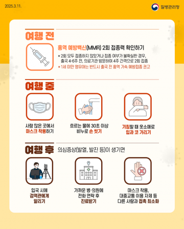 특히 면역체계가 취약한 1세 미만 영유아는 홍역에 감염되면 폐렴, 중이염, 뇌염 등 합병증이 발생할 가능성이 높으므로 홍역 유행 국가 방문을 최대한 자제하고, 방문이 불가피하다면 출국 전에 홍역 가속 예방접종을 받는 것이 좋다.
