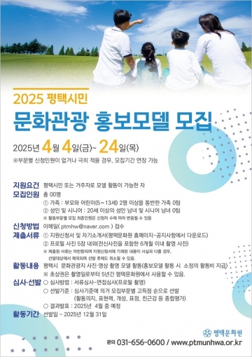 평택문화원(원장 오중근)에서 평택시의 문화관광 콘텐츠를 홍보하기 위한 ‘2025 평택시민 문화관광 홍보모델’을 모집하고 있다.