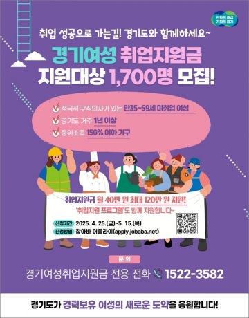 경기도가 경력보유여성 등 35~59세 사이 여성의 취업을 돕기 위한 ‘경기여성 취업지원금’ 사업 참여자 1,700명을 5월 15일까지 모집한다.