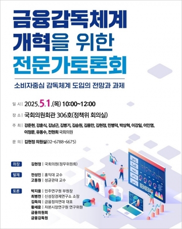 김현정 국회의원(더불어민주당, 평택병)은 5월 1일 오전 10시, 국회의원회관 정책위 회의실에서 ‘소비자 중심 감독체계 도입의 전망과 과제’를 주제로 금융감독체계 개혁을 위한 전문가 토론회를 개최한다.