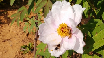 ▲ 밀원식물인 모란꽃에 모인 양봉꿀벌과 수중다리꽃등에(2020.4.29 배다리마을)