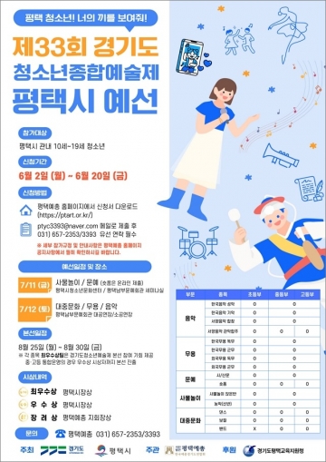 평택예총은 6월 2일부터 20일까지 ‘제33회 경기도청소년종합예술제(평택시 예선)’ 참가자를 모집한다. 이번 대회는 경기도와 평택시가 공동 주최하고, 평택예총이 주관하며 경기도평택교육지원청이 후원한다.