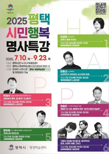 평택시(시장 정장선)는 시민들의 지식과 교양 증진 및 삶의 질 향상을 위해 오는 7월부터 9월까지 ‘2025년 평택시민행복 명사특강’을 운영한다.