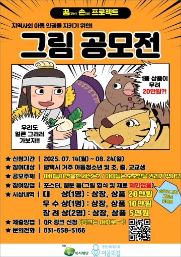 공모 대상은 평택시에 거주하는 아동·청소년 및 초등학생~고등학생까지로, 온라인 QR링크를 통해 접수할 수 있다. 심사를 거쳐 ▶대상(1명, 상장 및 상품 20만 원 상당) ▶우수상(1명, 상장 및 상품 10만 원 상당) ▶장려상(2명, 각 상장 및 상품 5만 원 상당)이 수여된다.