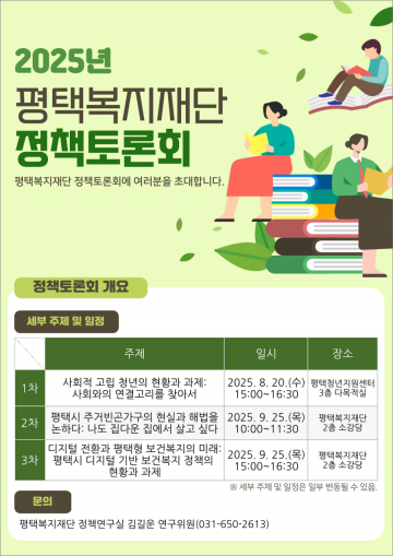 (재)평택복지재단(대표이사 최을용)은 8월부터 9월까지 총 3차례에 걸쳐 ‘2025년 평택복지재단 정책토론회(이하 토론회)’를 개최한다.
