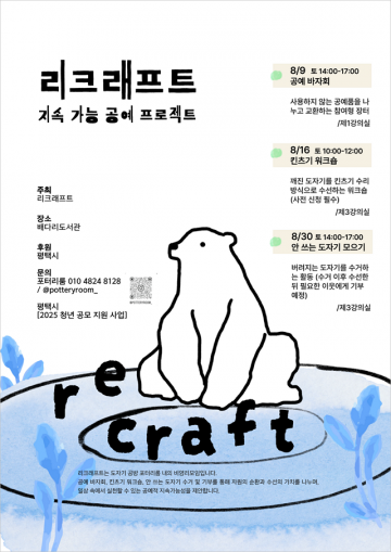 ‘리크래프트’는 도자기 공방 포터리룸 내에서 활동하는 비영리 청년 모임으로, 일상 속에서 실천할 수 있는 공예적 지속가능성을 제안하고 자원의 순환과 수선의 가치를 시민들과 나누고자 이번 프로젝트를 기획했다.