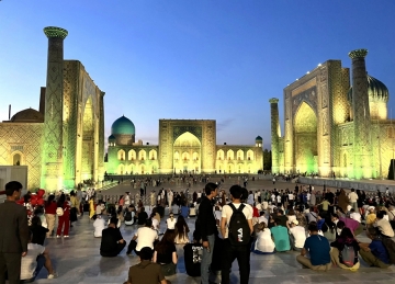 사마르칸트(Samarkand, 인구 60만)로 넘어가는 길. 오색 조명으로 치장한 레기스탄 광장은 무척 화려했다. 첫눈에 16세기 티무르제국의 도읍지를 정복했다는 우즈벡인들의 자부심이 느껴질 만큼 갈색 톤이 인상적이었다. 과거 알현할 때나 공공집회가 열렸던 장소로 동양의 건축미를 집약적으로 보여주고 있었는데, 눈앞 비비하눔이야말로 중앙아시아 모스크의 진수로 손꼽는다는 설명에 힘이 실리는 모양새. 그 배경에 15세기 티무르왕이 전사한 손자를 추모하기 위해 세운 구르에미르 영묘가 자리하고 있다. 그다음 찾은 곳은 울르그벡 천문대. 저명한 학자의 반열에 올랐던 임금이 15세기 초에 이미 1년 365일의 비밀을 풀어냈다니 놀라운 일이다. 그에 딸린 아프로시압 박물관의 전시물 역시 한때 동방의 로마로 불리던 영화를 대변하고 있었다. 그러고 보니 부하라에는 실크로드를 가로지르는 지역답게 군데군데 뽕나무들이 눈에 띄었다. 예전에는 낙타 등에 물건을 가득 실은 대상들로 붐볐을 테지만 가이드 말대로 아직도 시어머니가 며느리 운명을 옥죄고 흔든다면 이는 가정파괴를 일삼은 터여서 뒷맛이 씁쓸했다.