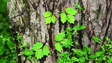 흡착근을 이용해 주변 나무를 타고 오르는 담쟁이덩굴(2014.5.8. 덕동산마을숲)