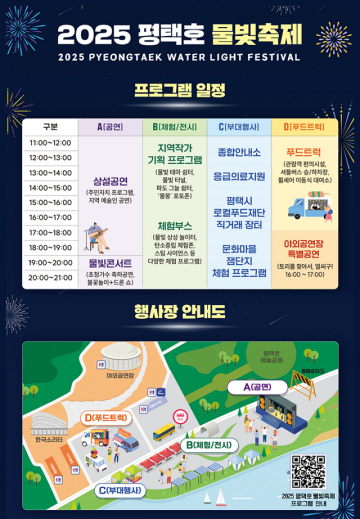 올해 평택호 물빛축제는 ‘물’과 ‘빛’을 주제로 즐길 수 있는 불꽃과 드론 등 다양한 프로그램을 준비했으며, 행사장은 ▶A구역(상설공연, 물빛콘서트) ▶B구역(지역작가 기획 프로그램, 체험부스) ▶C구역(평택시로컬푸드재단 직거래 장터, 문화마을 잼단지 체험 프로그램) ▶D구역(푸드트럭, 야외공연장 특별공연) 등 네 개 구역으로 나뉘어 운영된다.