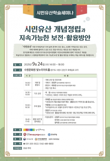 (사)한국국가유산지킴이연합회(회장 최호운)는 오는 9월 24일 수원문화원 빛누리아트홀에서 ‘시민유산 개념정립과 지속가능한 보전·활용방안’을 주제로 시민유산 학술세미나를 개최한다고 밝혔다.