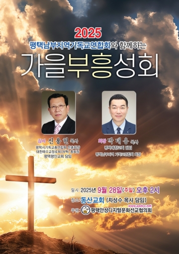 평택남부지역기독교연합회(회장 박태용 목사, 이하 평기남)는 오는 9월 28일(일) 오후 2시, 평택시 문화촌로에 소재한 동산교회(차성수 위임목사 시무)에서 예장 개혁 총회장 신용현 목사(평택평안교회 담임목사)를 강사로 초청하여 평기남 각 교회 목회자와 성도가 참여하는 평택 남부지역 기독교연합회와 함께하는 교회연합 가을부흥회를 개최한다.