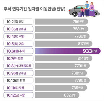 올해 추석은 10월 3일~9일까지 긴 연휴가 이어지는 가운데 총 이동 인원은 3,218만 명, 일 평균 이동 인원은 775만 명으로 예상된다.