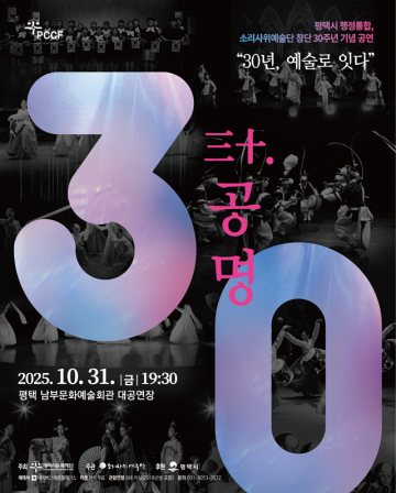 (재)평택시문화재단(대표이사 이상균)은 평택시 행정통합 30주년과 경기도 지정 전문 예술법인 소리사위예술단 창단 30주년을 기념하여, 오는 10월 31일(금) 오후 7시 30분, 평택 남부문화예술회관 대공연장에서 기념공연 〈三十, 공명(삼십, 공명)〉을 개최한다.