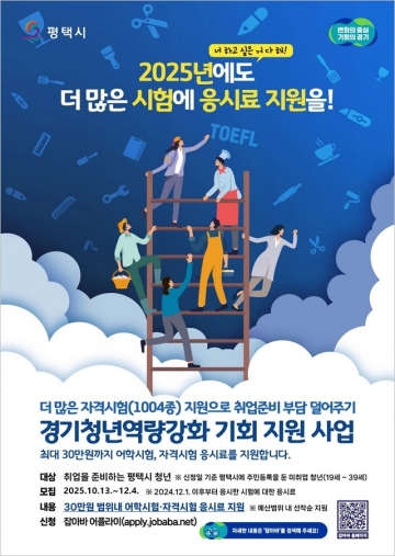 평택시(시장 정장선)는 관내 미취업청년들에게 더 고른 취업 기회를 제공하기 위해 어학·자격시험 응시료 지원 사업인 ‘경기청년 역량 강화 기회 지원 사업’의 참여자를 추가 모집한다고 밝혔다.